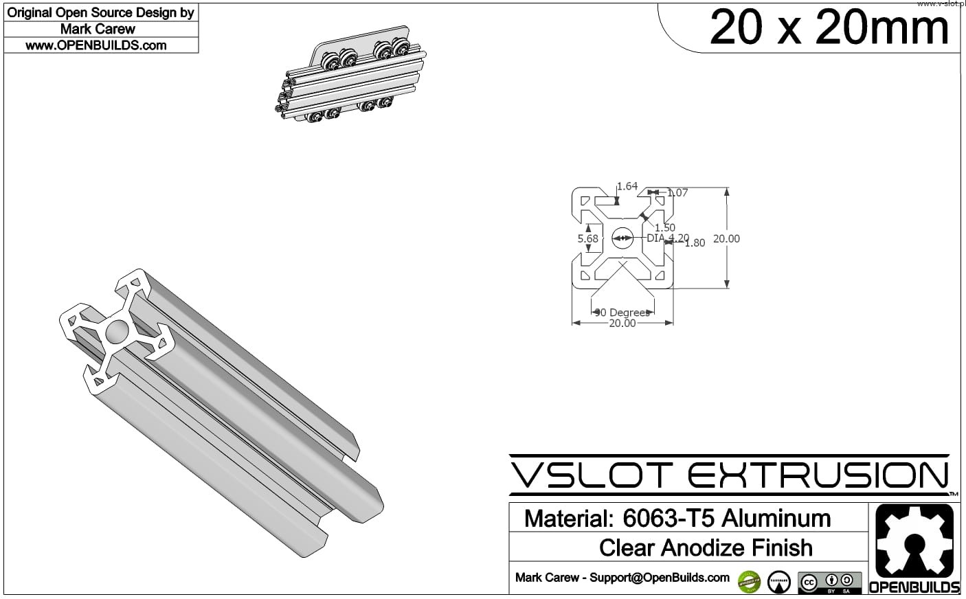 V-Slot® 2020 aluminium profile with a special design for linear motion. The profile has a specially designed V-shaped groove on 4 sides. Openbuilds has autonomously developed every type of profile and component, constructing them with the greatest attention to detail. V-Slot 20x20 profiles are fully covered with a special coating (anode) which guarantees protection of the structure against external factors. Scratches do not damage the profiles.