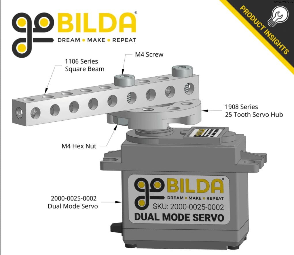 The GoBILDA 2000-0025-0002 servo is the successor to the popular 2000-0025-0001 servo. The 25-2 has received some noteworthy updates, including an ultra-strong steel gear, more torque, and a new top case. Like its predecessor, the 25-2 offers two different modes that allow it to fulfill different roles in a robot or project.