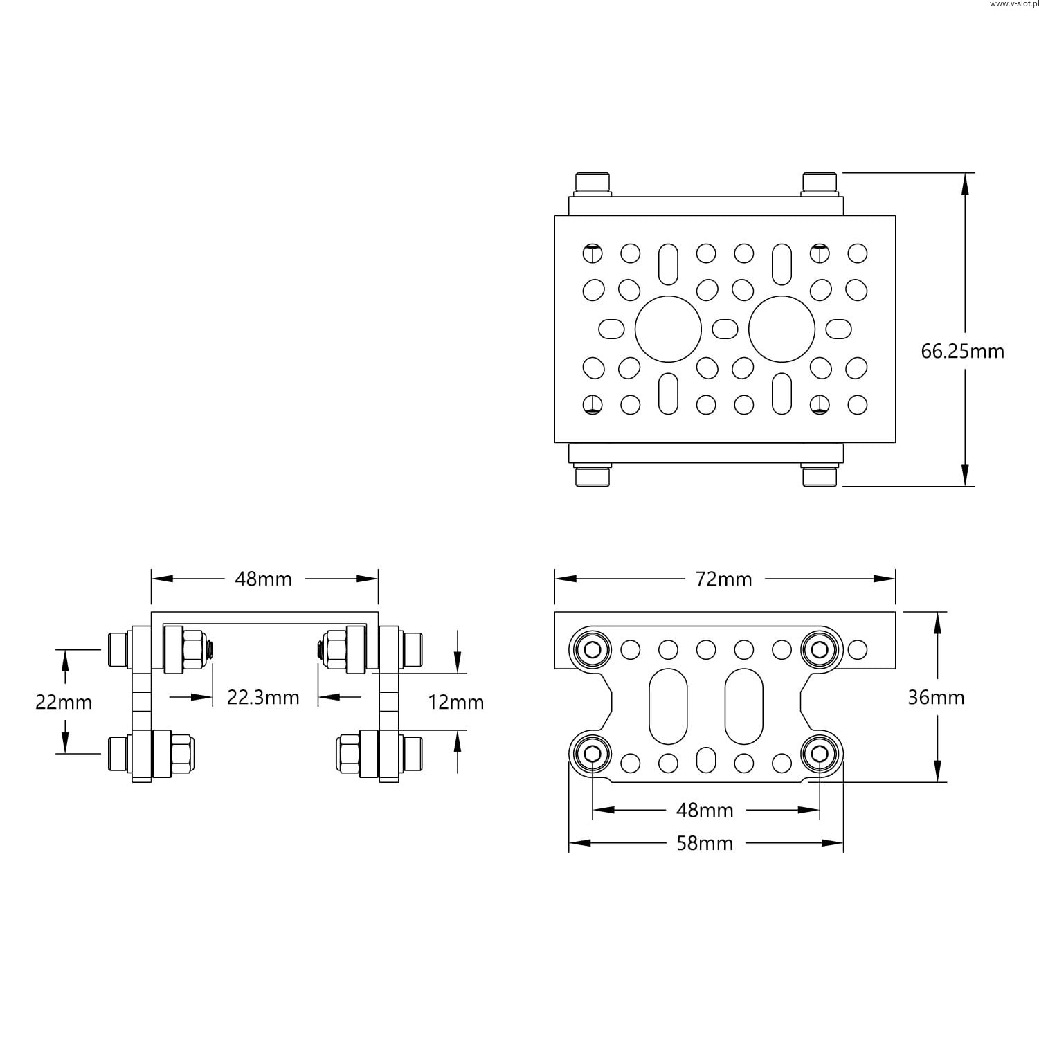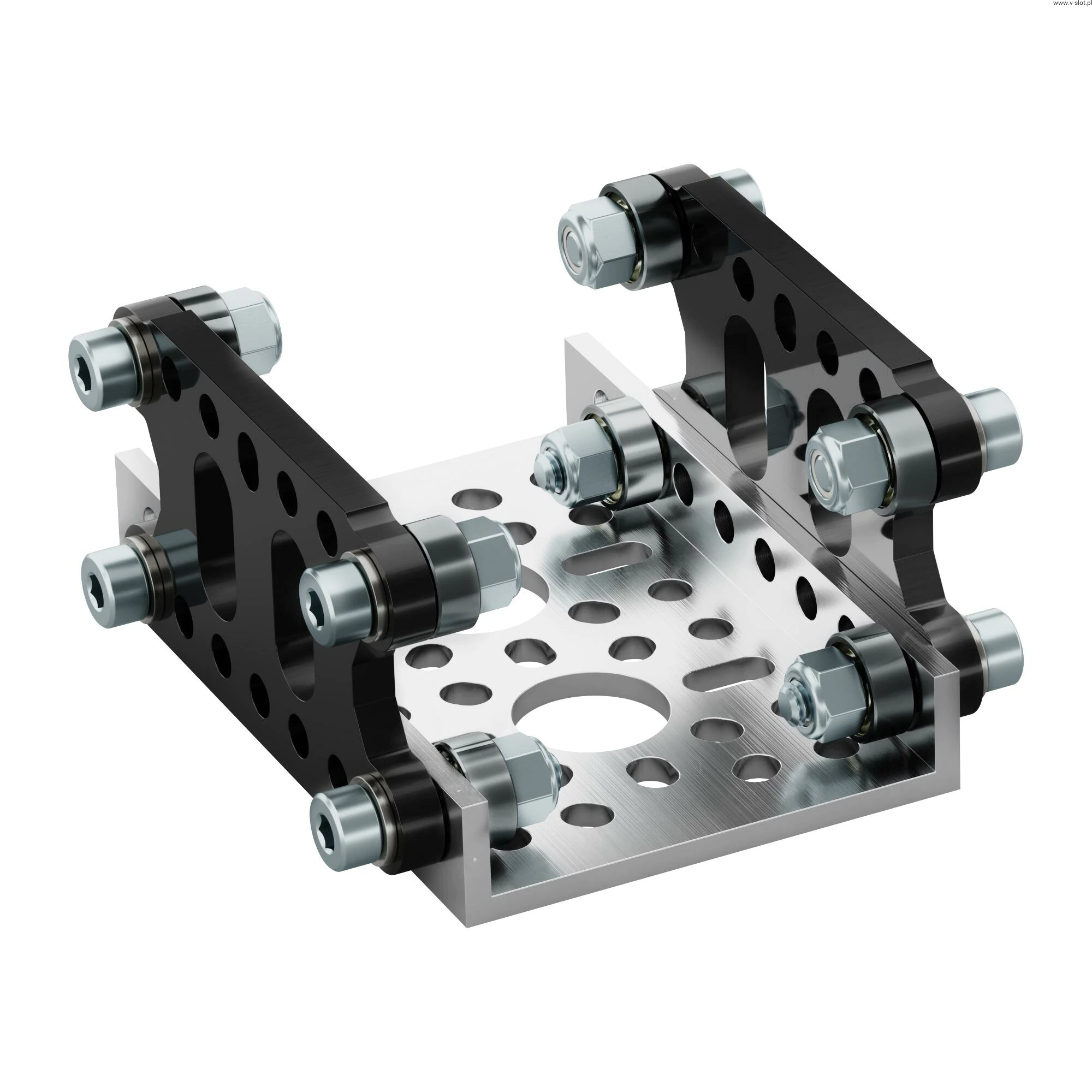 This ball bearing carriage is designed to run on the 1121 series bottom profile. The carriage is suspended by eight ball bearings, providing excellent stability with a very low coefficient of friction. The plates have many unused holes that can be used to connect the drive style of your choice.