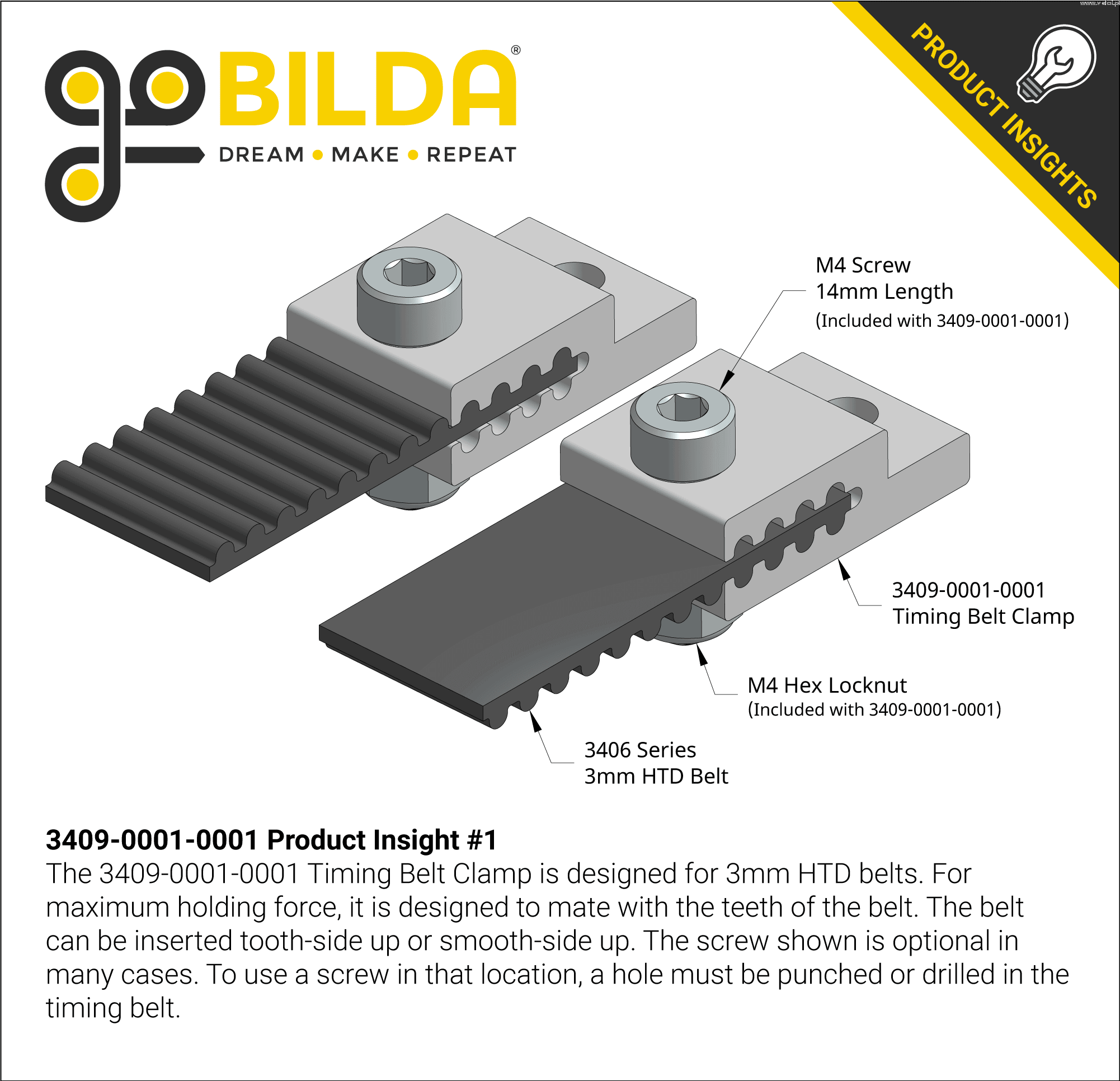 Toothed belt clamps are great for attaching a severed belt to get your construction moving. Sections of shortened lanes, as opposed to continuous lanes, are typically used in applications that do not require running over a pulley. For example, the XY table may be driven by a pulley and a cut section of belt. To create the movement, the belt will need to be properly tightened and attached to the chassis. The clamps will fit a 3mm HTD timing belt inserted in any orientation. For added security, make a 4mm hole in the belt, insert the supplied 14mm M4 socket head bolt through the belt clip, and tighten the M4 locknut for an extra solid connection.