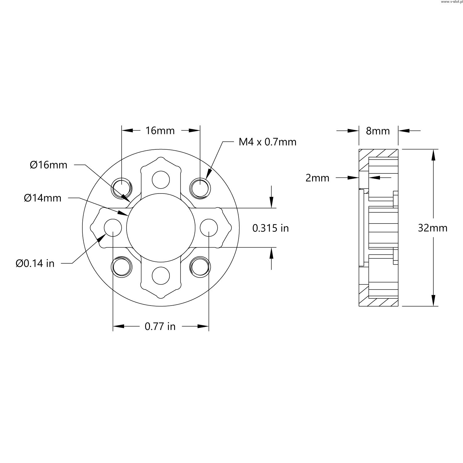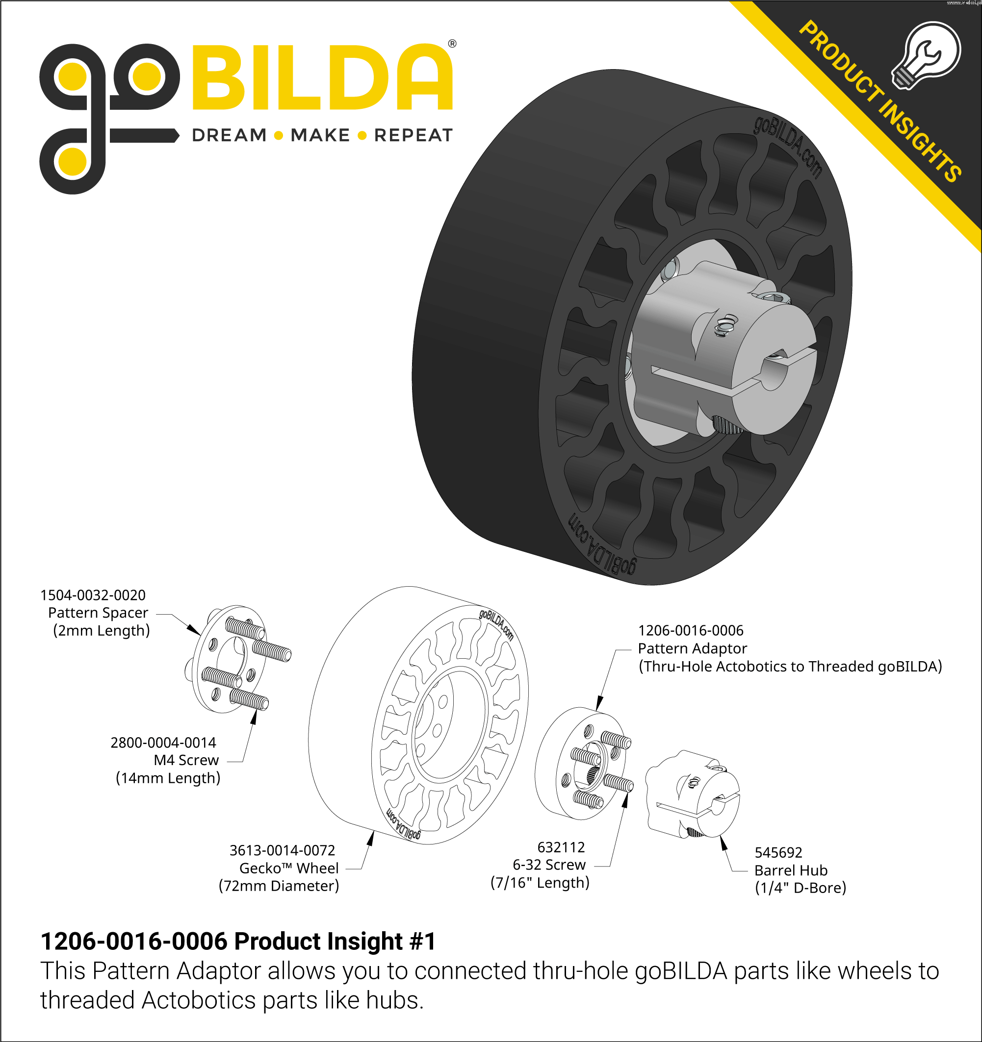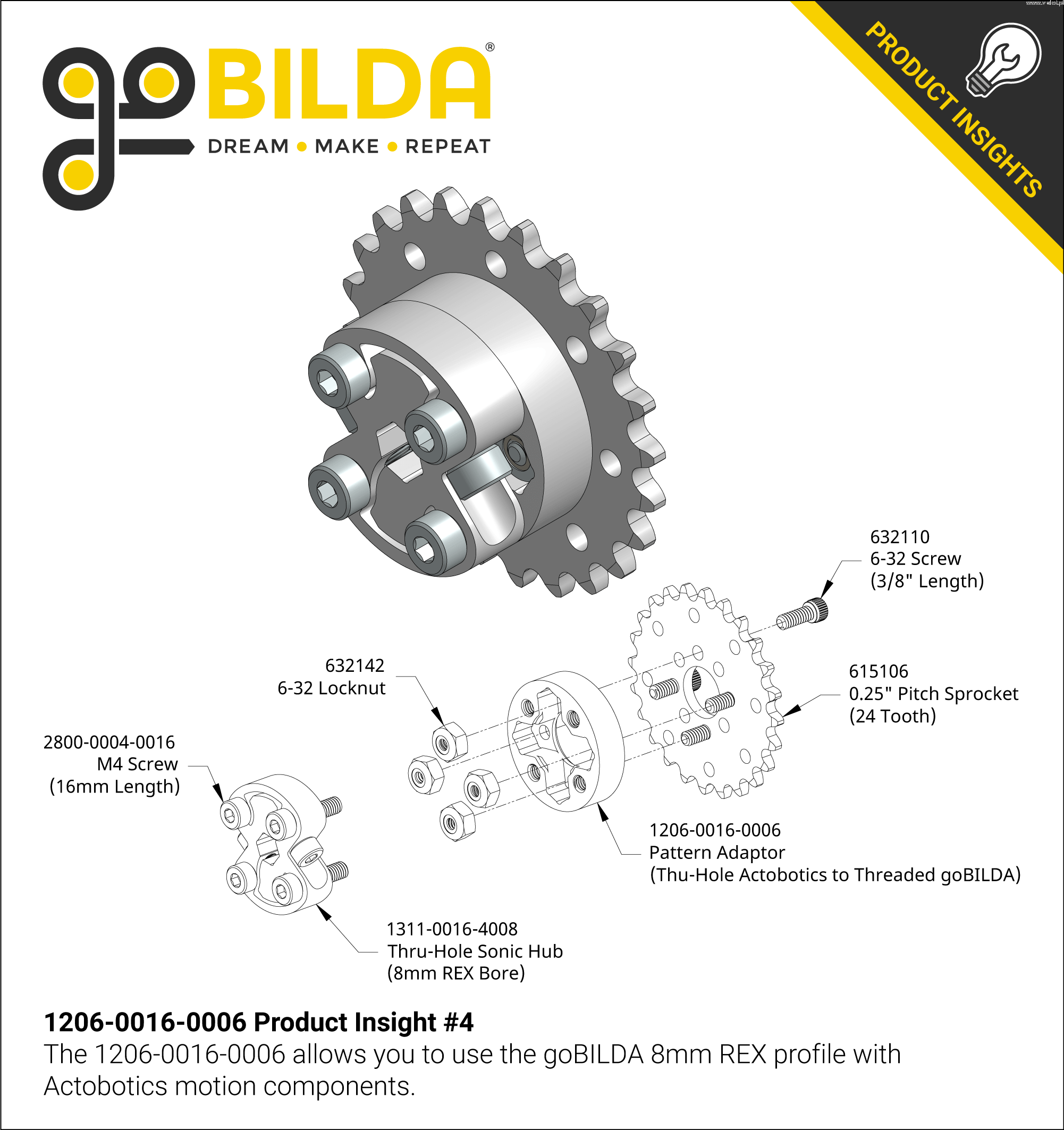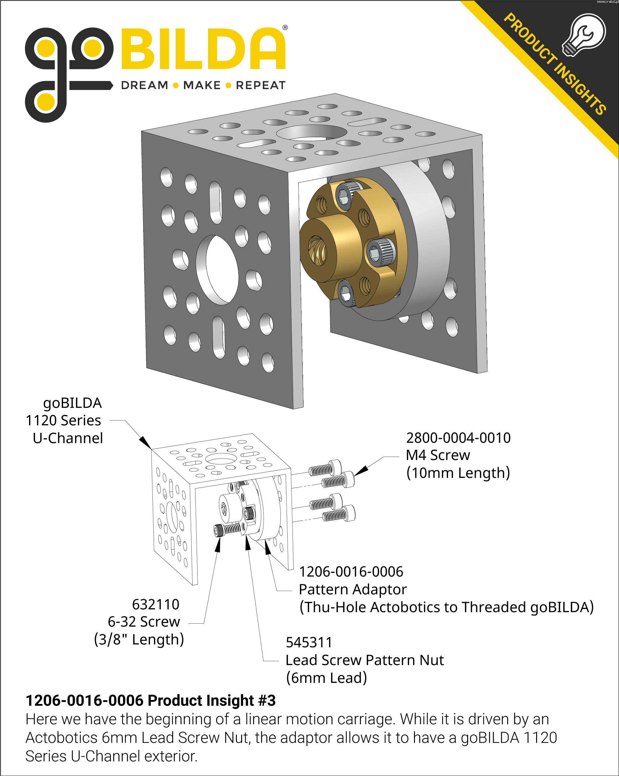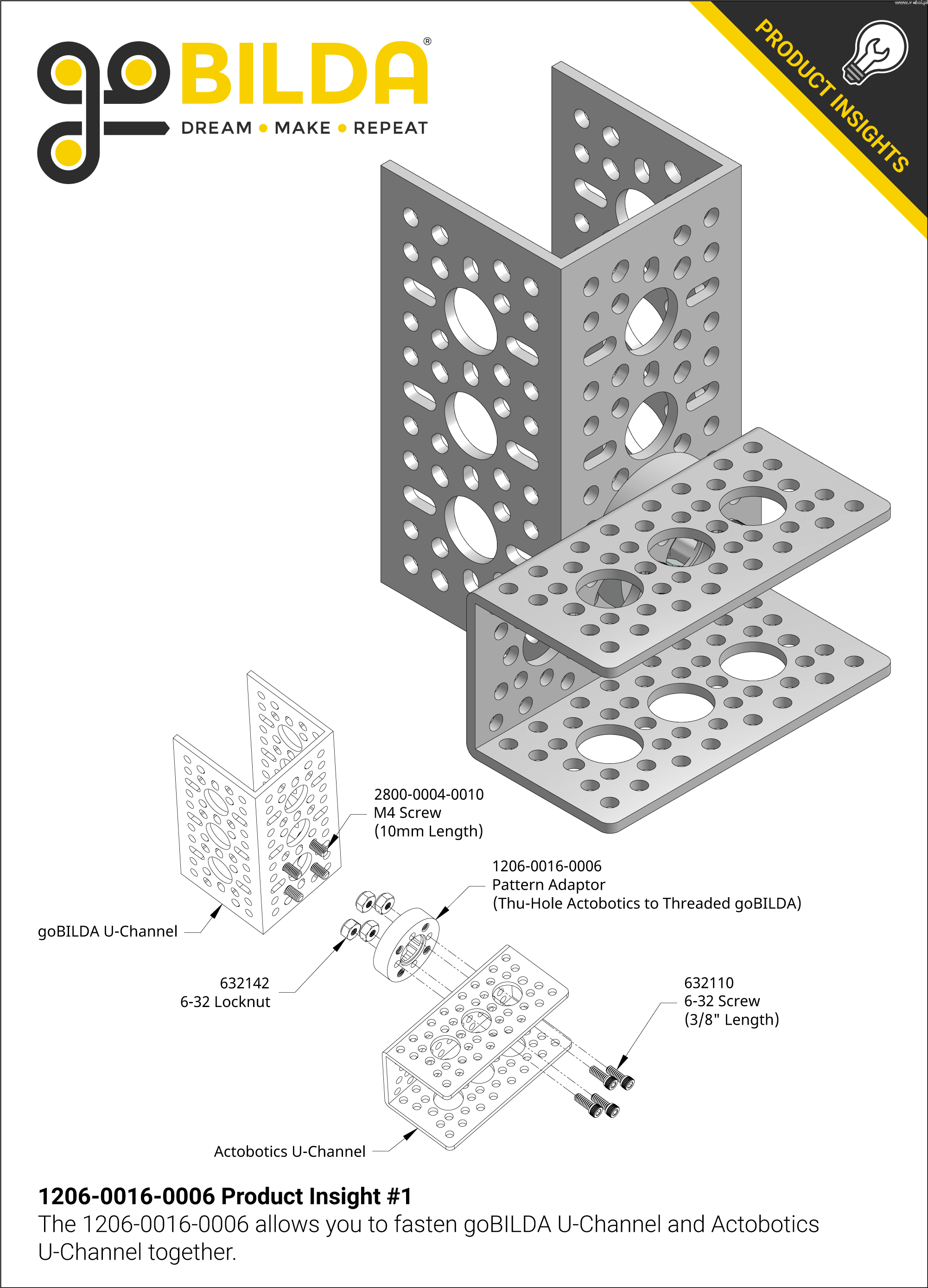 Otwory przelotowe w tym adapterze są zgodne z układem 0,77" systemu Actobotics. Śruby 6-32 lub nakrętki blokujące 6-32 (rozmiar sześciokątny 5/16") mogą spoczywać w otworach, pozostawiając górną powierzchnię wolną do zamocowania następnej części. Gwintowane otwory M4 są rozmieszczone na siatce 16mm, którą można znaleźć w goBILDA.