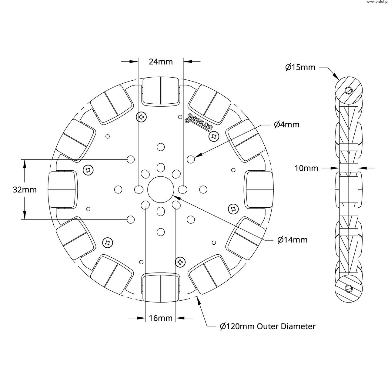 Omni wheel 3604 series (14mm bore, 120mm diameter)