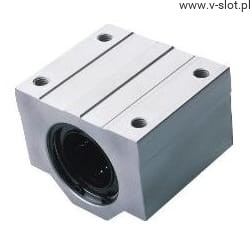 Linear bearings in an aluminum housing, anodized with threaded mounting holes. The housing has four threaded mounting holes.