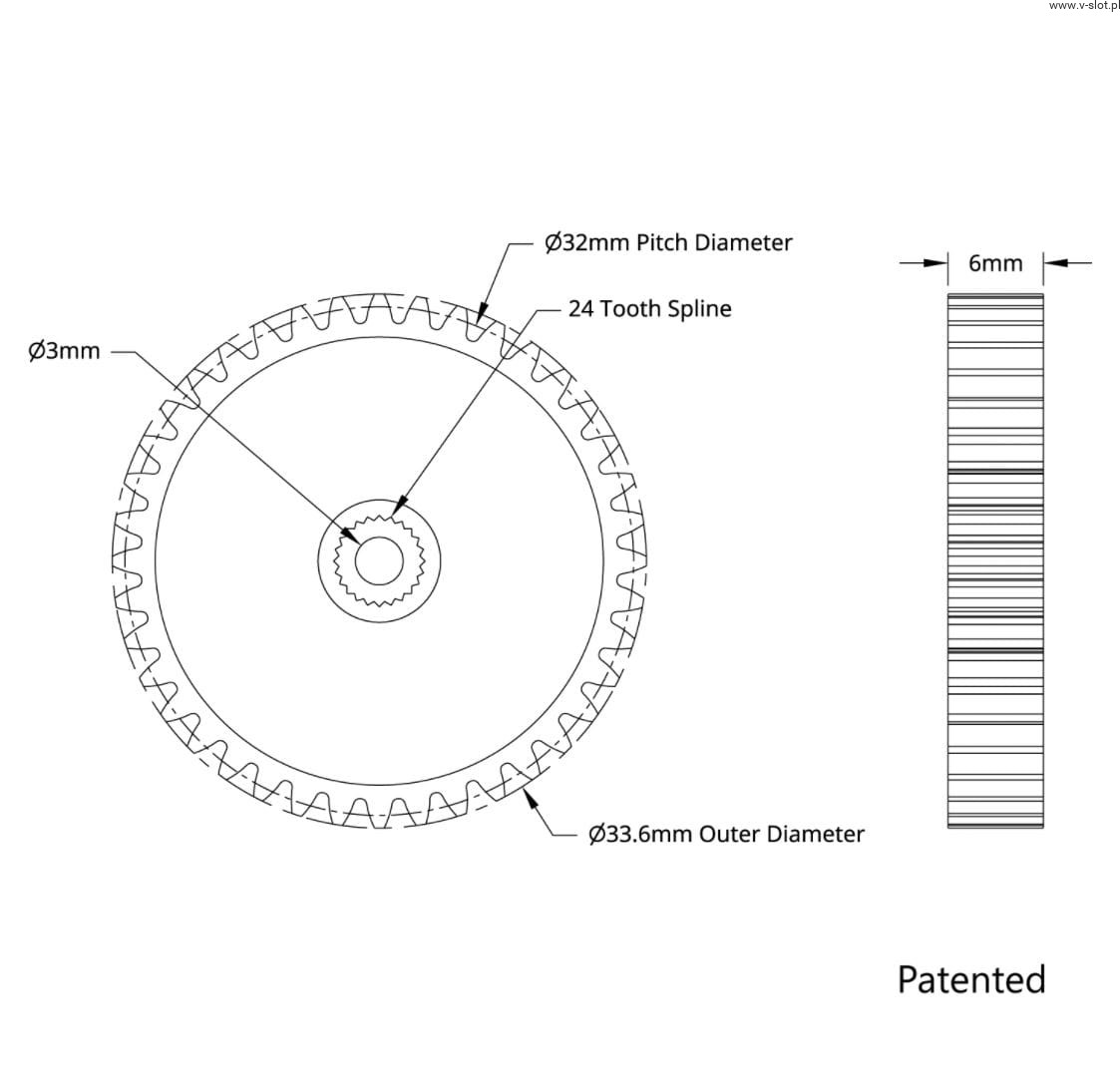 This gear reduction will increase the torque on the gear of the hub to 2 times that produced by the servo. Ta przekładnia może być również używana do napędzania 20 zębatego koła zębatego oddalonego o 24 mm dla przełożenia 2:1.