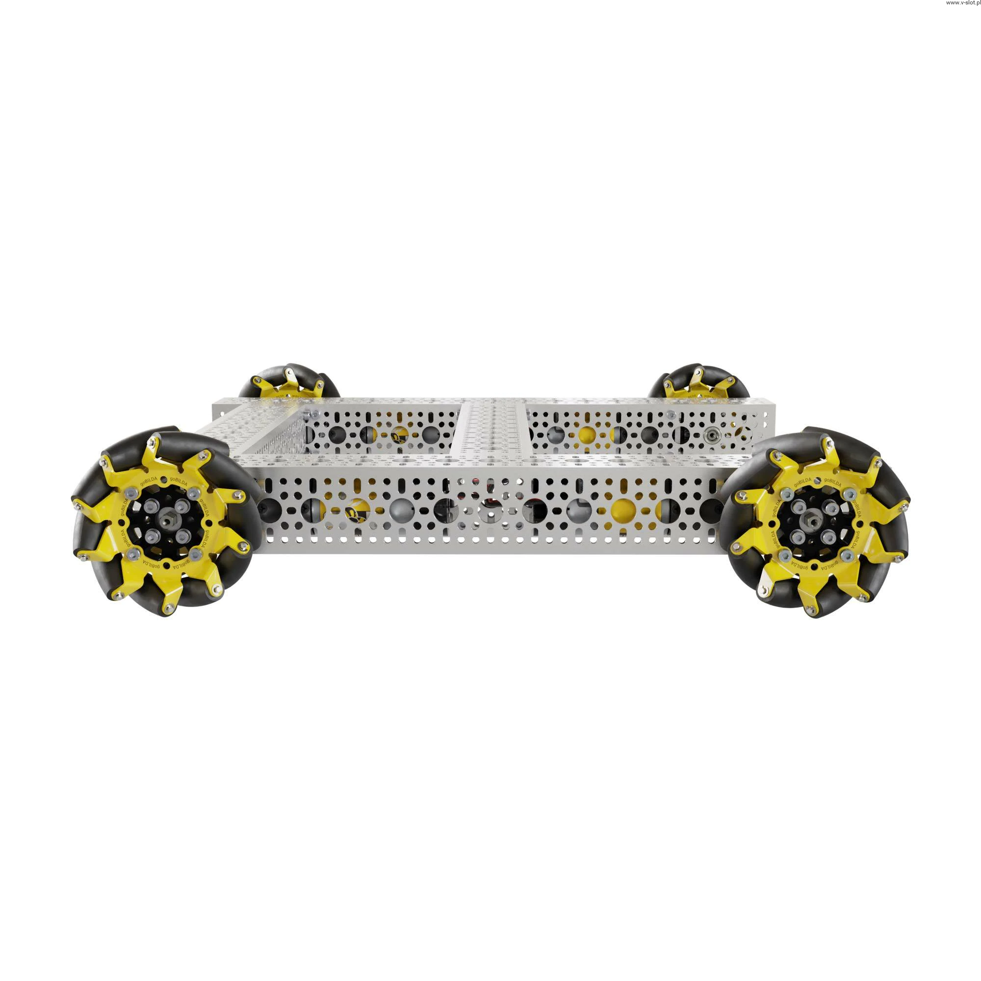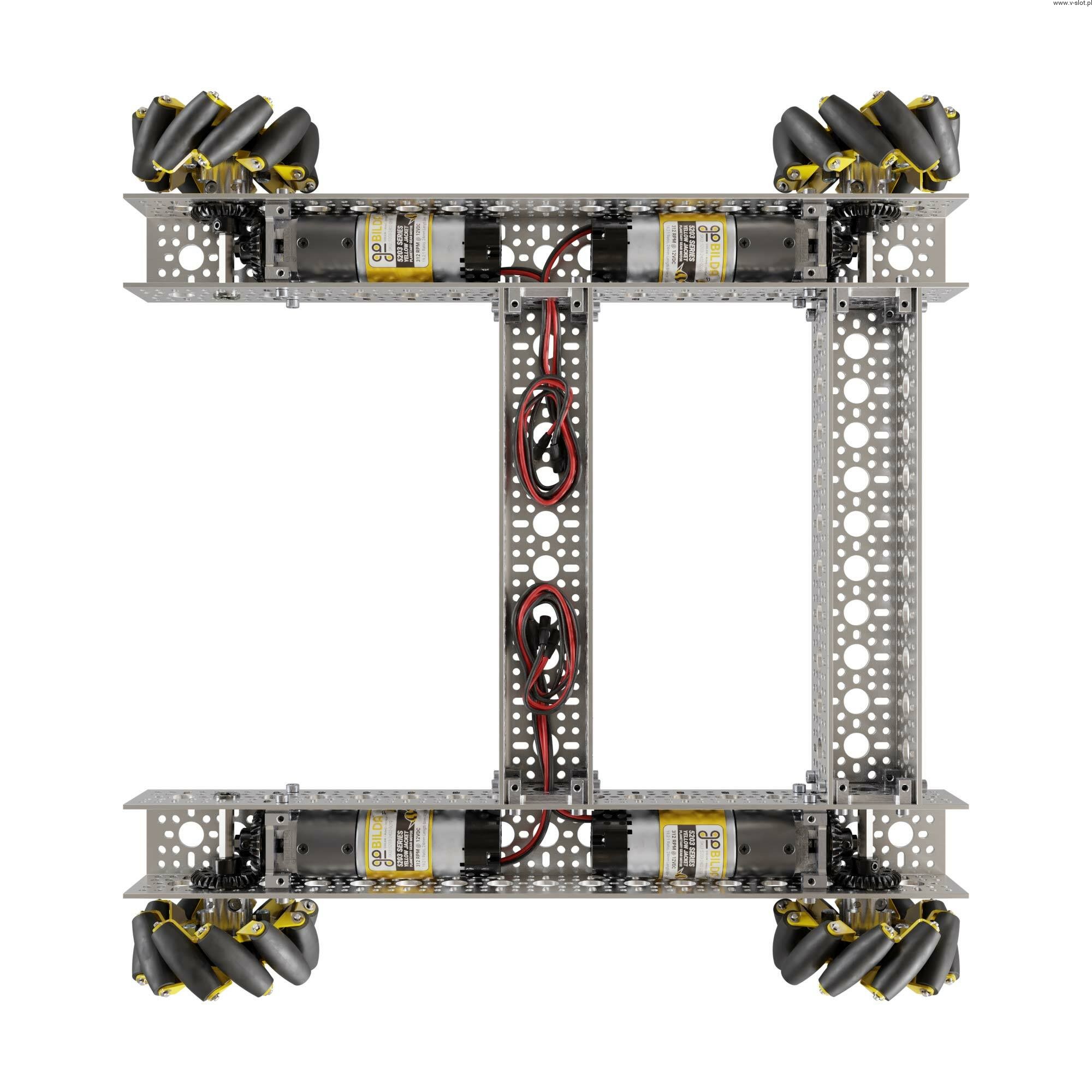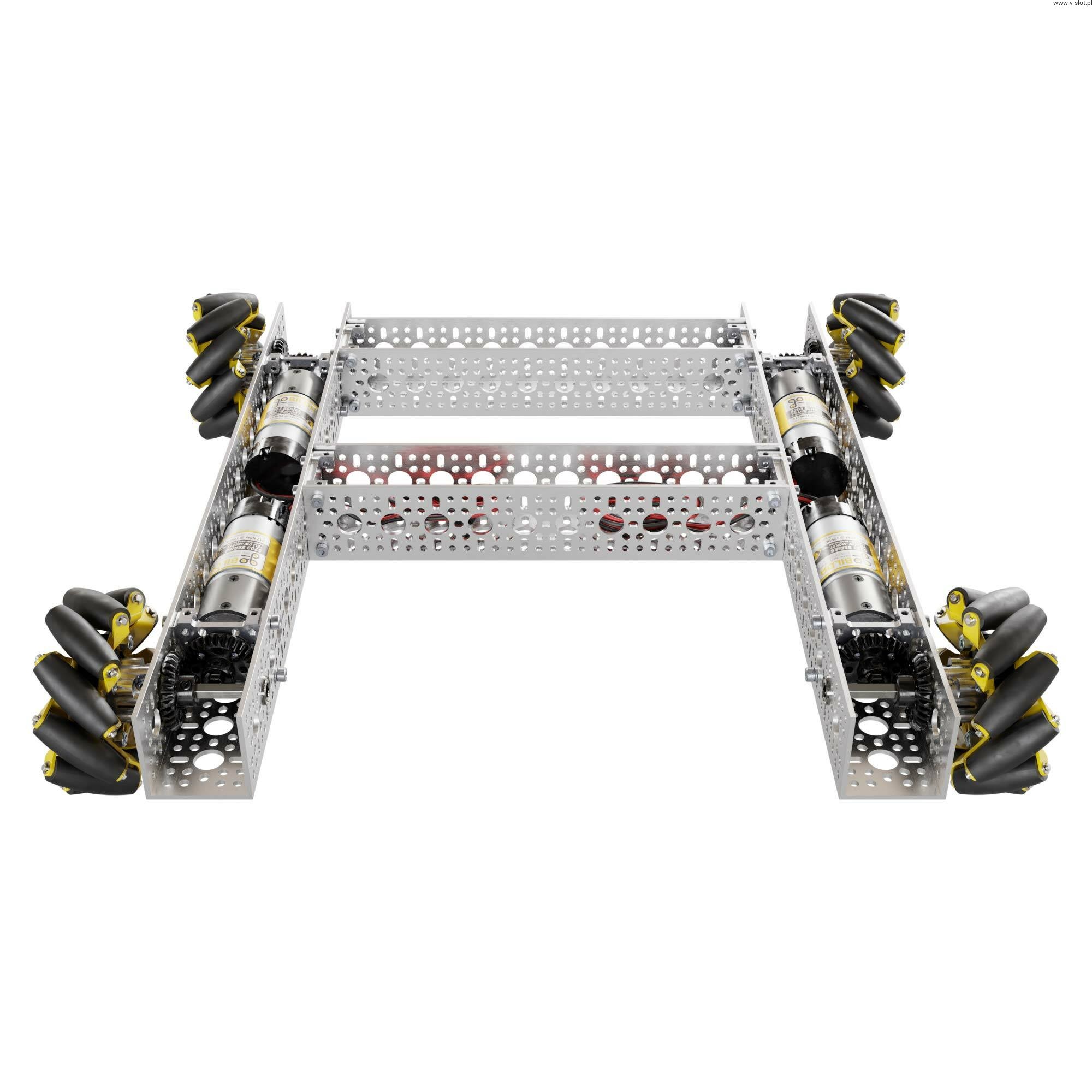 At first glance, you may be wondering where are the engines? Turn it over and you will notice the 312RPM 5203 series planetary gear motors are hidden away. Coupled with 96mm wheels, they give a theoretical speed of over 1.5m / s. These motors drive all steel gears, heavy duty hubs and ball bearings, ready for action with low friction!