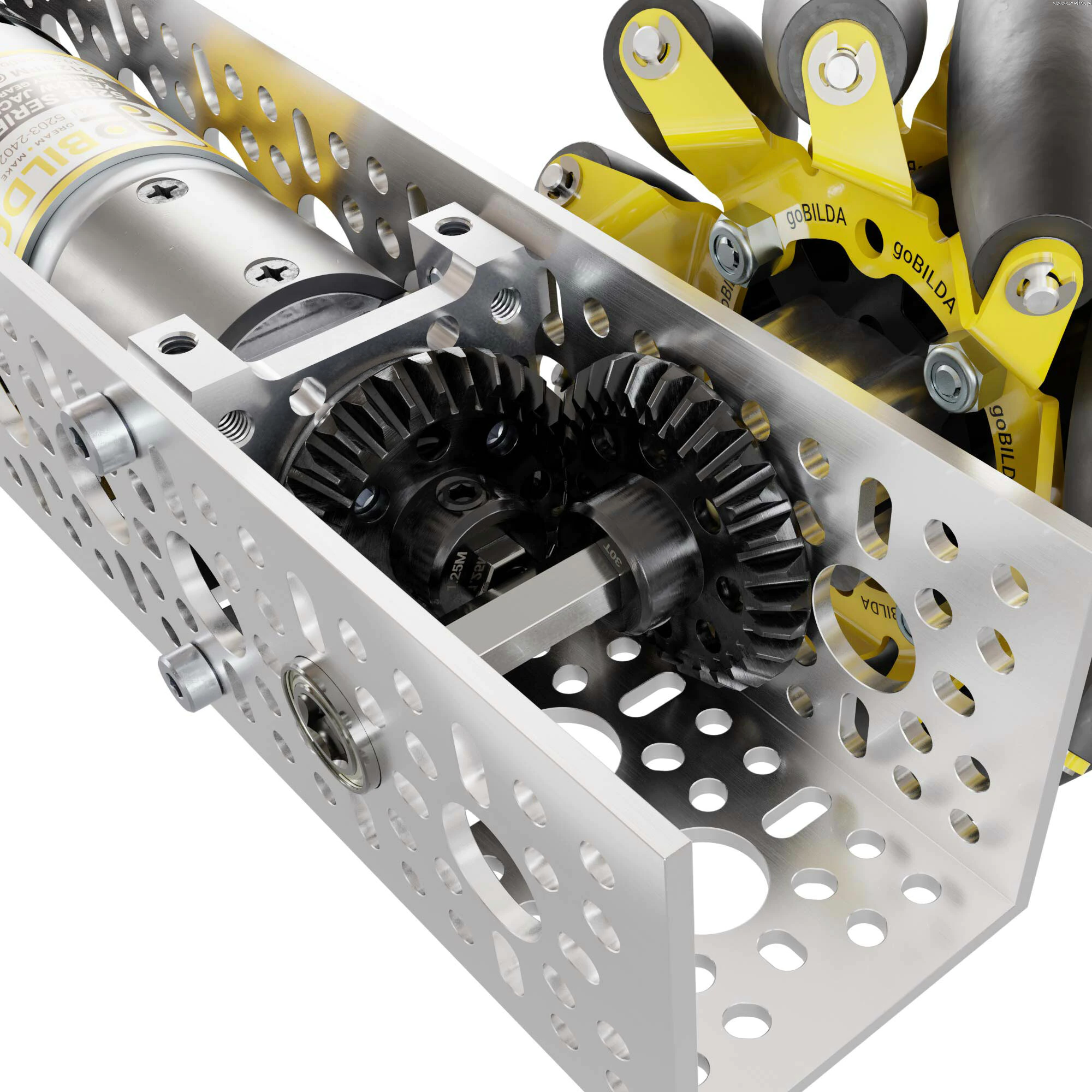 Bevel gears, located near each of the four corners of the housing, create a 90 ° drive, allowing motors to be mounted in the 1120 series U-profile.