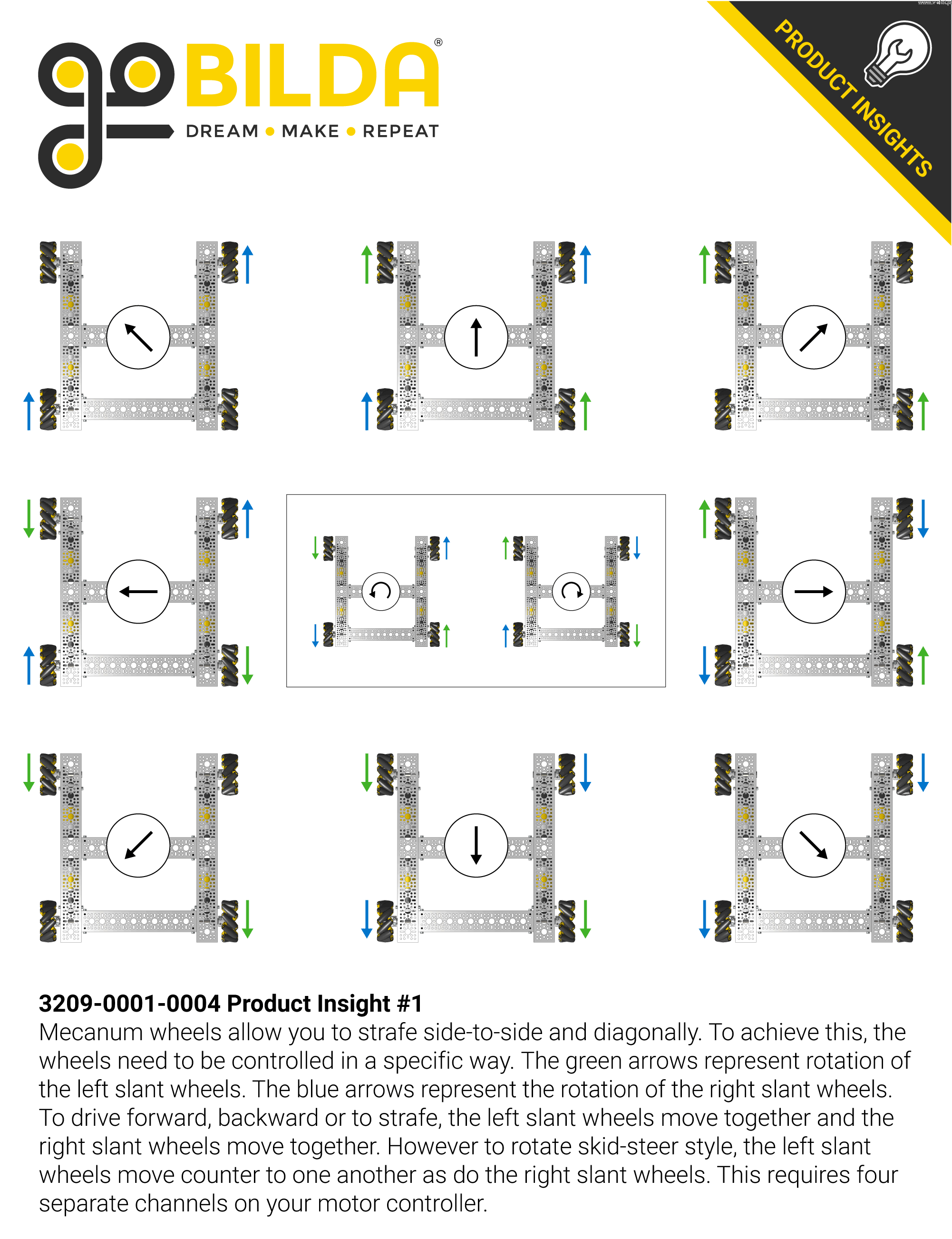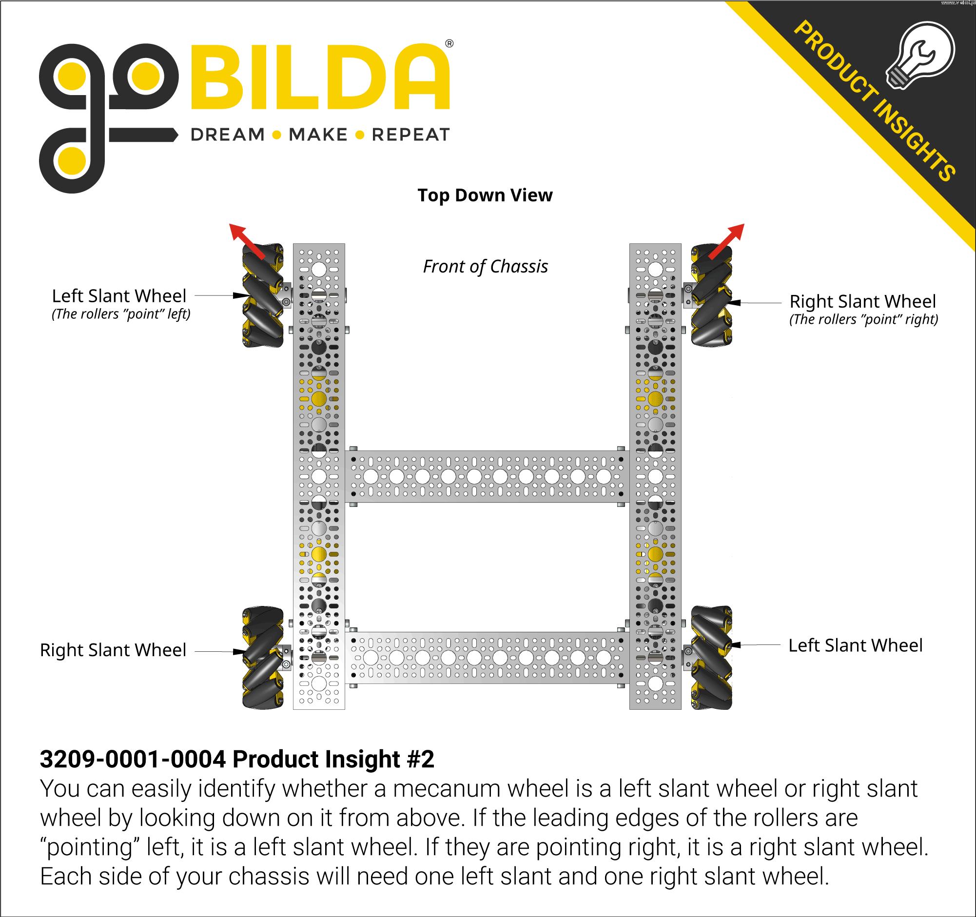 GoBilda Mecanum wheels have a diameter of 96 mm, rollers on ball bearings, a narrow profile and steel side plates. Each wheel is only 207g - much smaller than the competition. Reduced rotating mass ensures faster acceleration with less encumbrance on the motors.