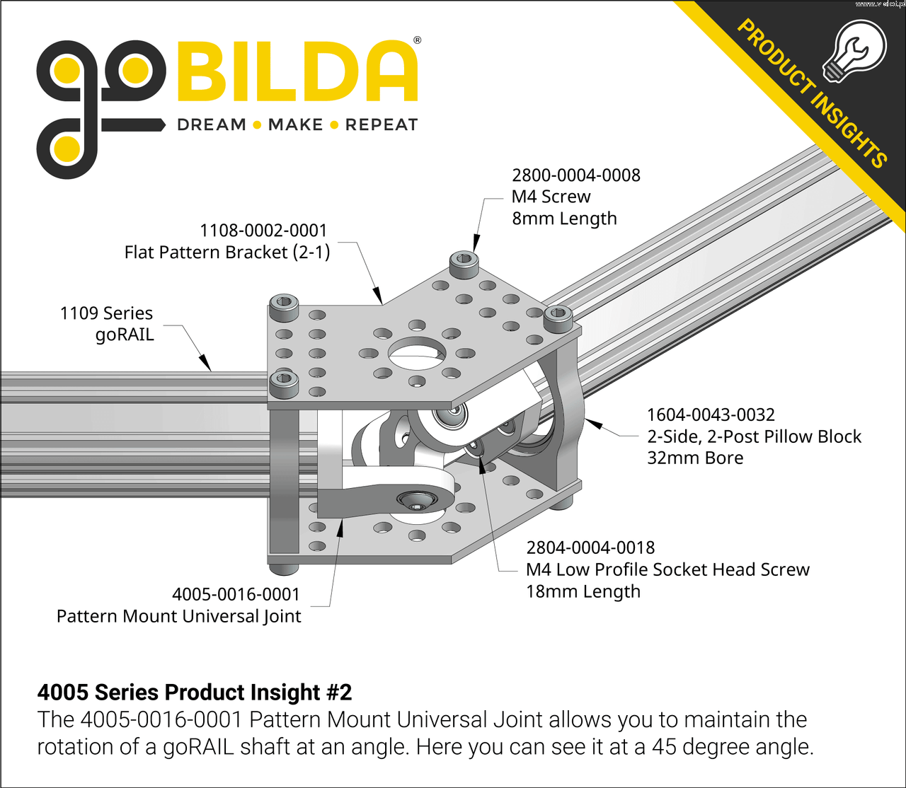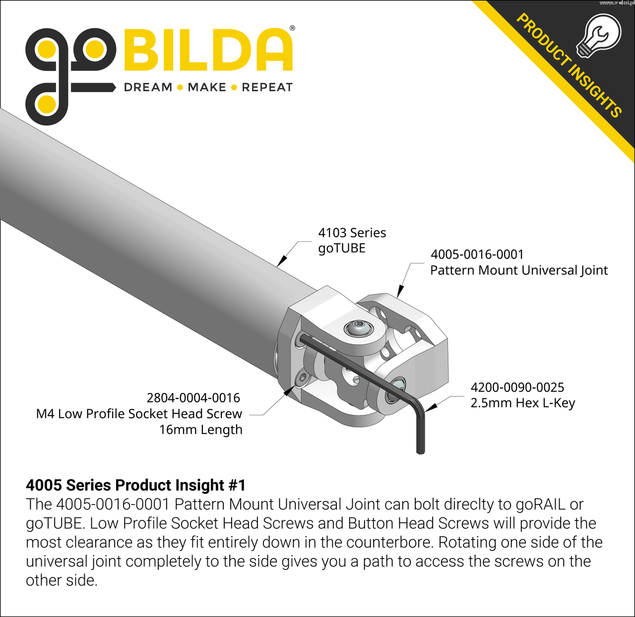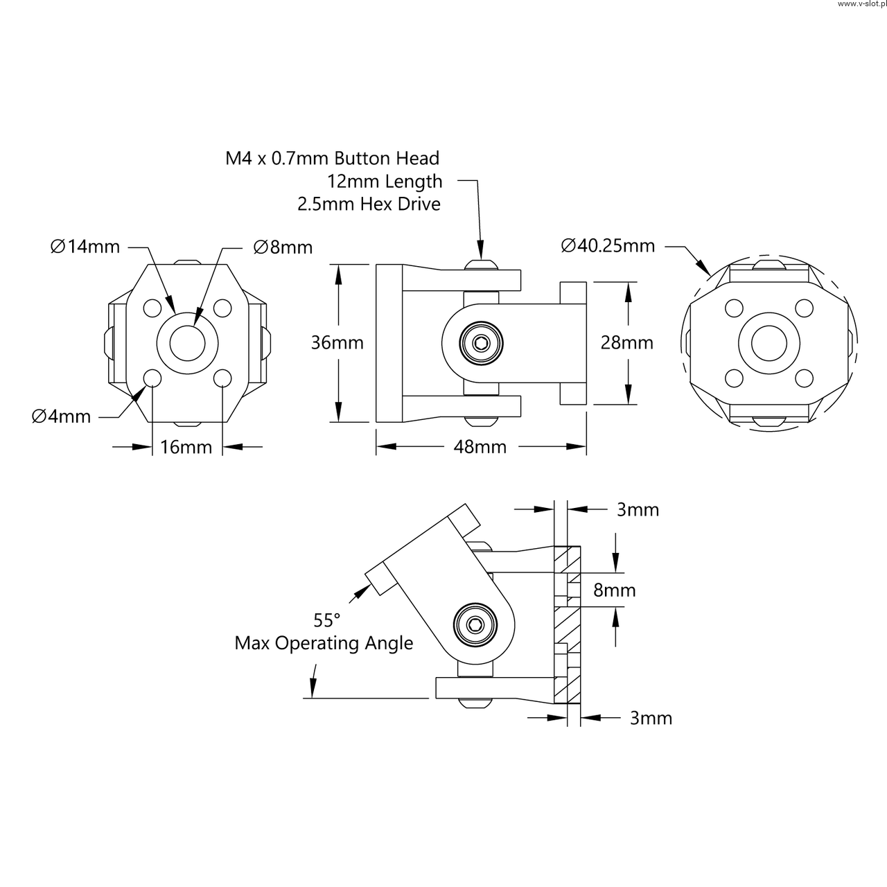 This joint is the bigger brother of Universal joint 4003-1006-1006. As the name suggests, this connector is capable of attaching 16mm to the Bilda to form large, solid swivel assemblies. Each M4 bolt passes through a 4mm inner diameter ball bearing to keep the friction coefficient low.