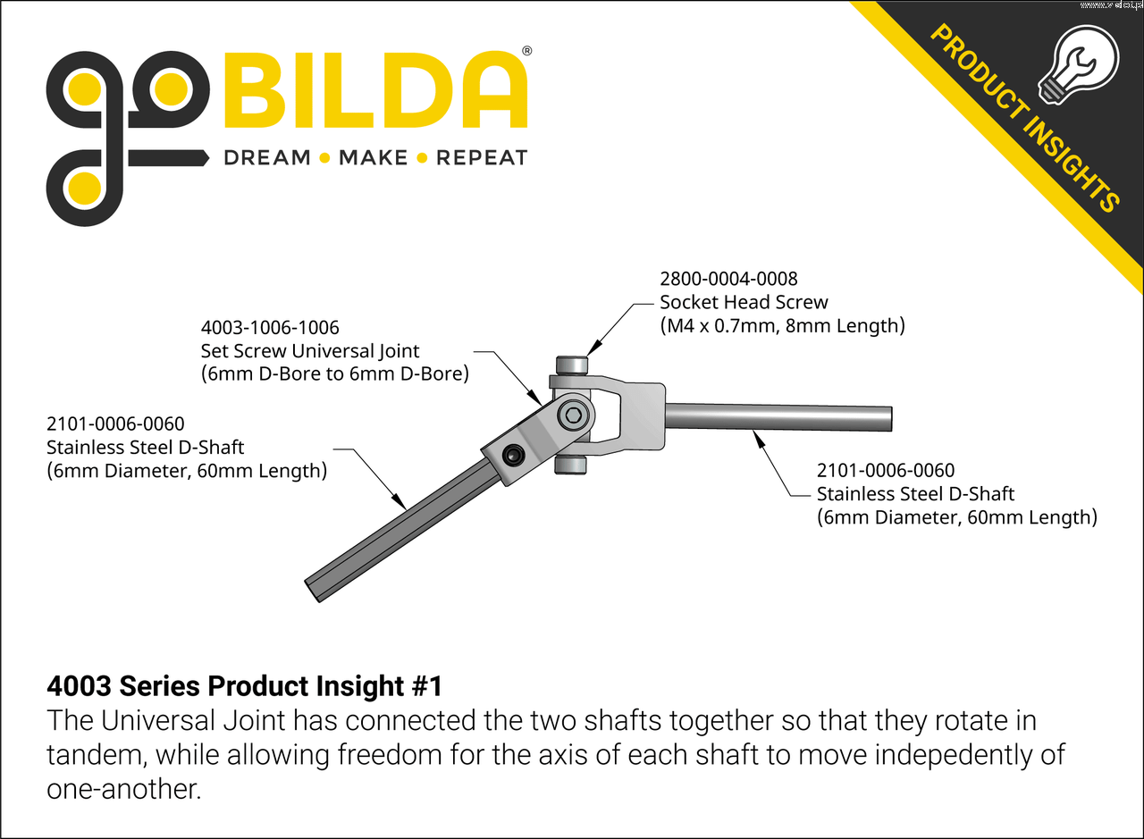 The universal joint is used to transmit a rotary motion from one D 6 mm shaft to another. The D-profile in combination with the set screw on each side, ensures that the shafts do not slip and that the torque can be reliably transferred in the drive system of the robot.