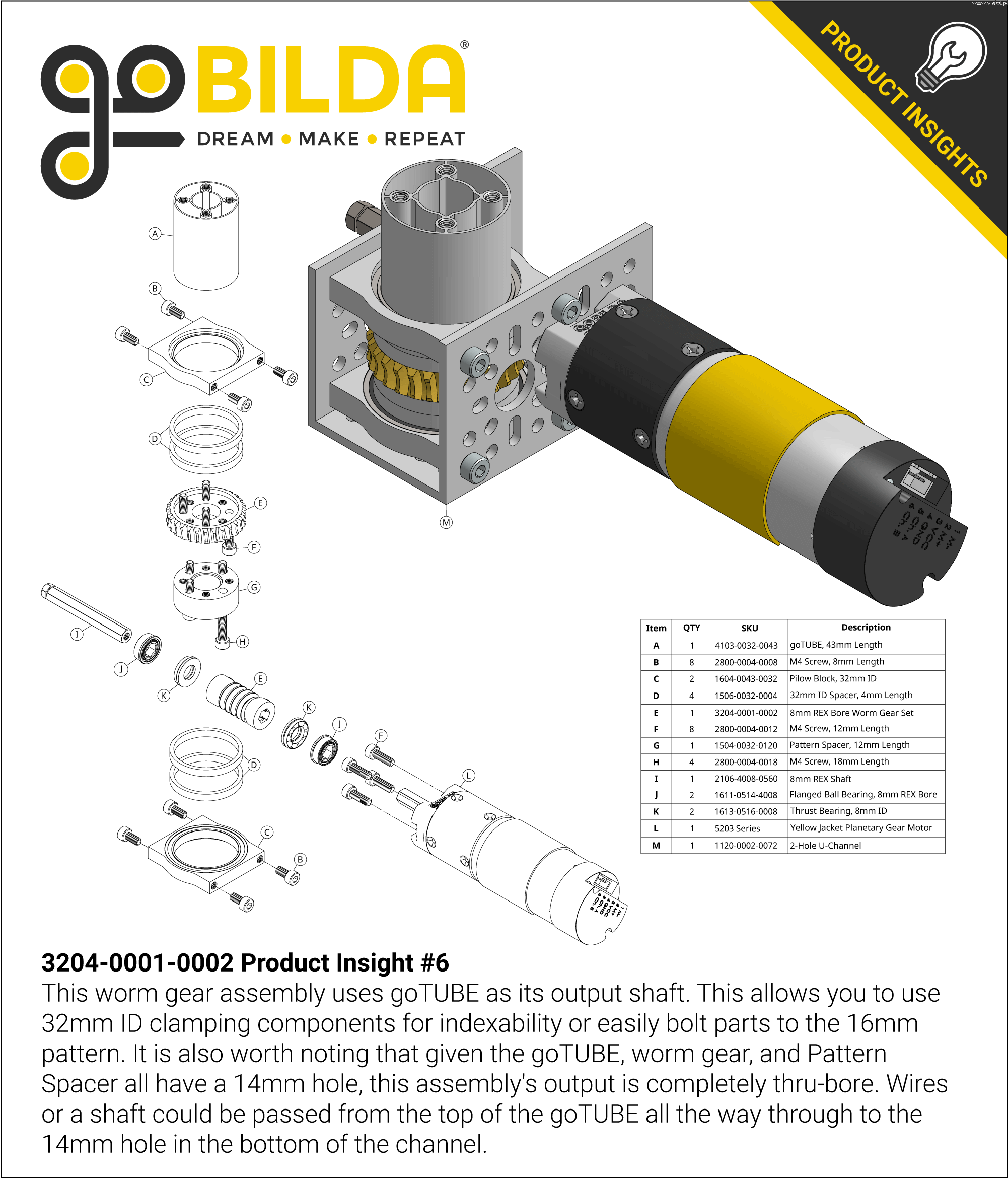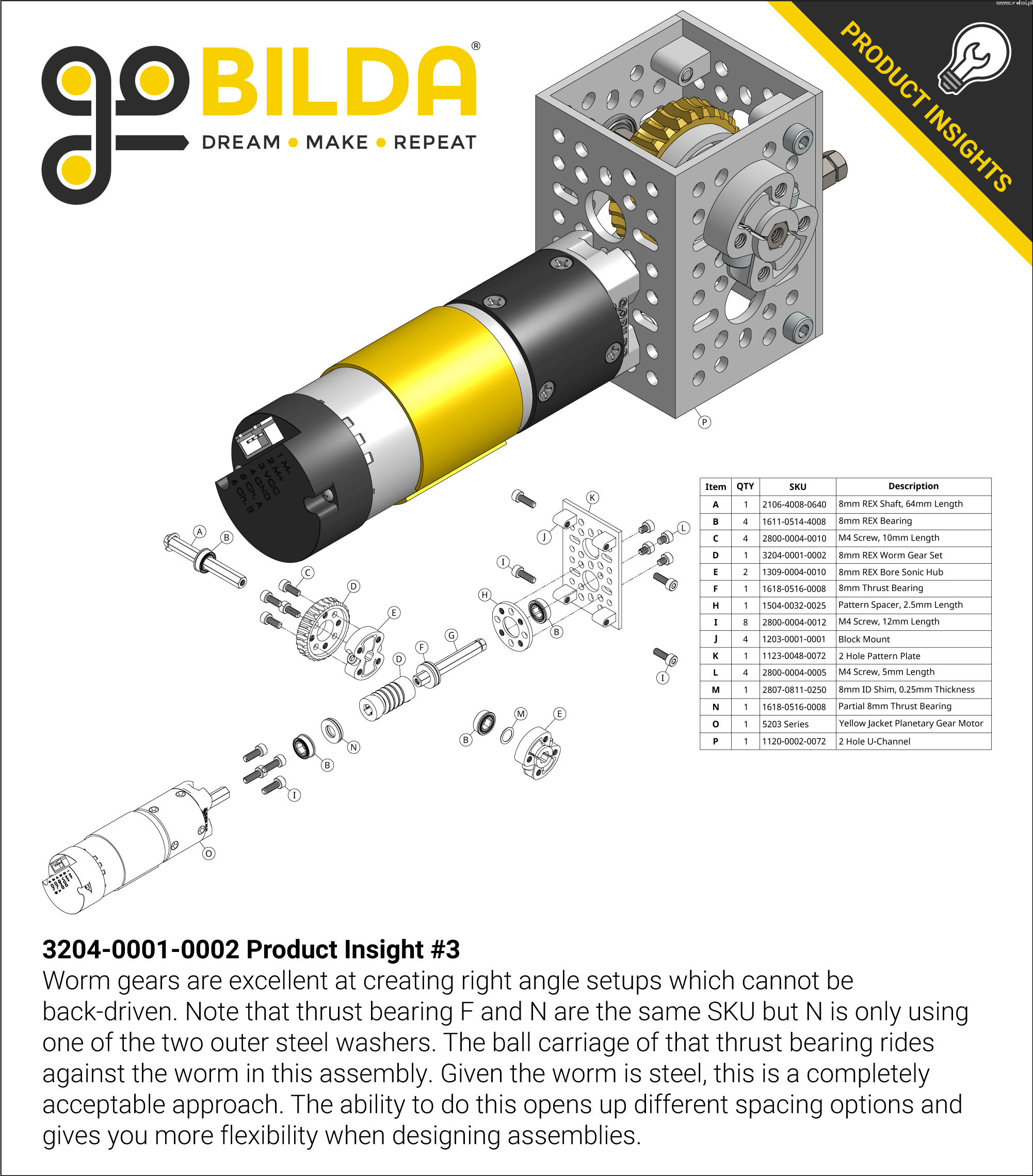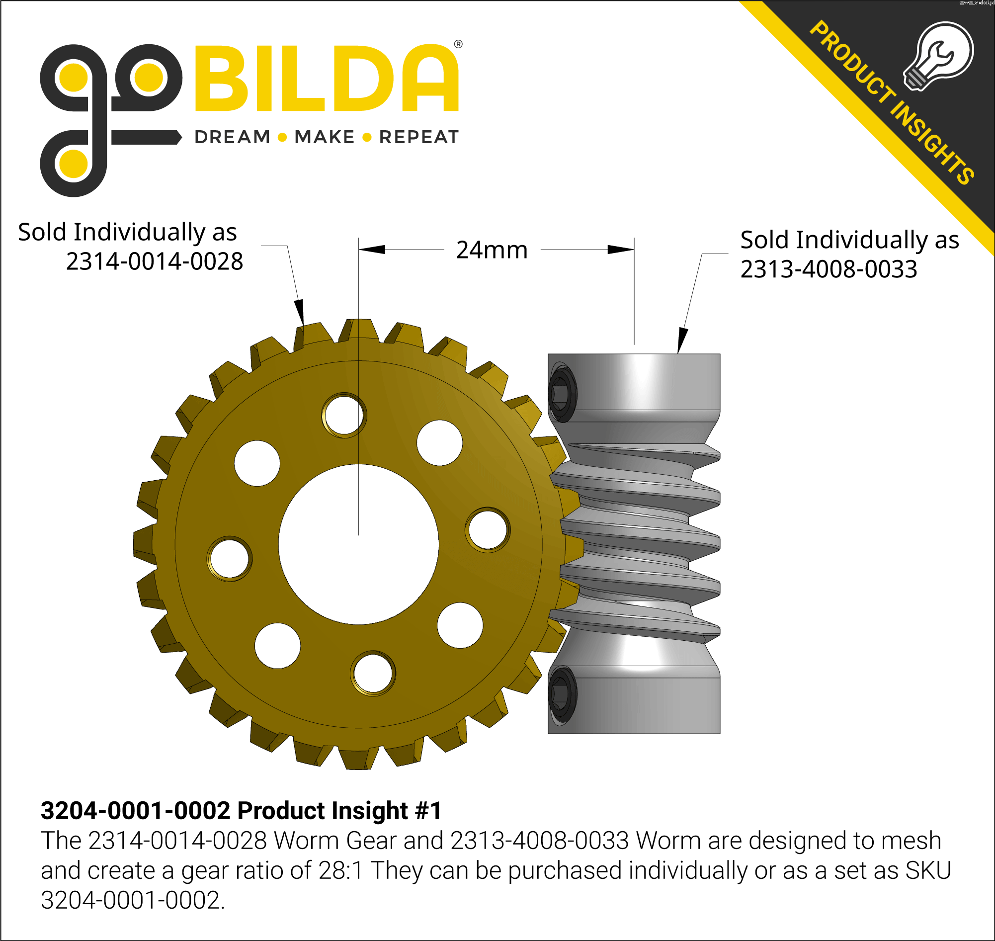 This 28: 1 ratio worm gear kit is the perfect way to slow down and increase torque! Worm gear sets are also a popular choice in non-reversible applications. While this kit can be used outside of the 1120 series channel, the sprocket sizes conform to an internal width of 43mm.