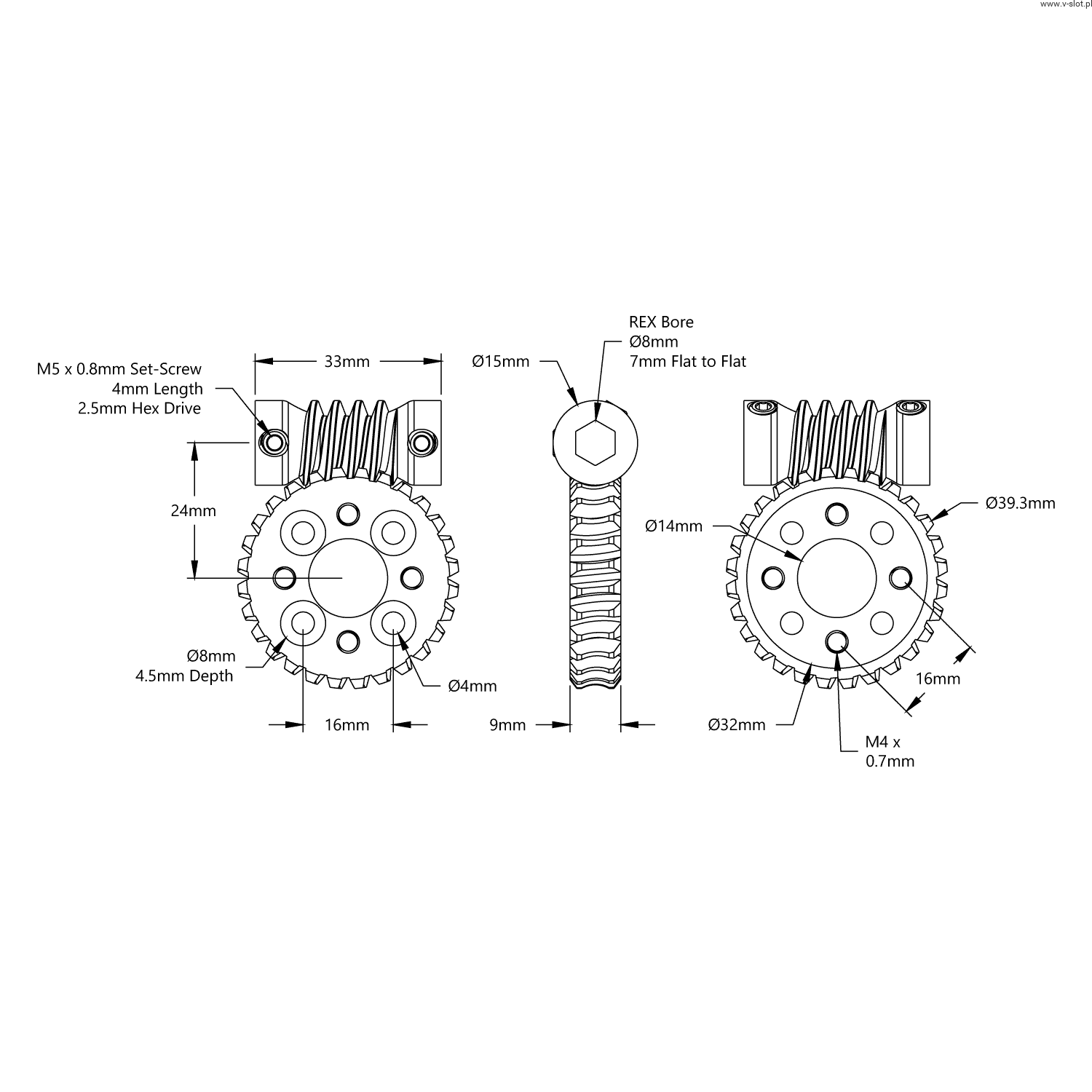 The worm gear is a stainless-steel component to be driven by an 8mm REX shaft. The auger 8mm REX bore creates a positive drive so there is no possibility of slipping between it and the shaft driving it. The grub screws are not necessary if the worm itself is gripped by the frame in which it is installed. They come in handy in situations where the worm is not axially constrained. The length of the worm screw is 33mm, so that the combination of the screw, the thrust bearing, and the radial bearing at each end fits perfectly into the 43mm channel width.